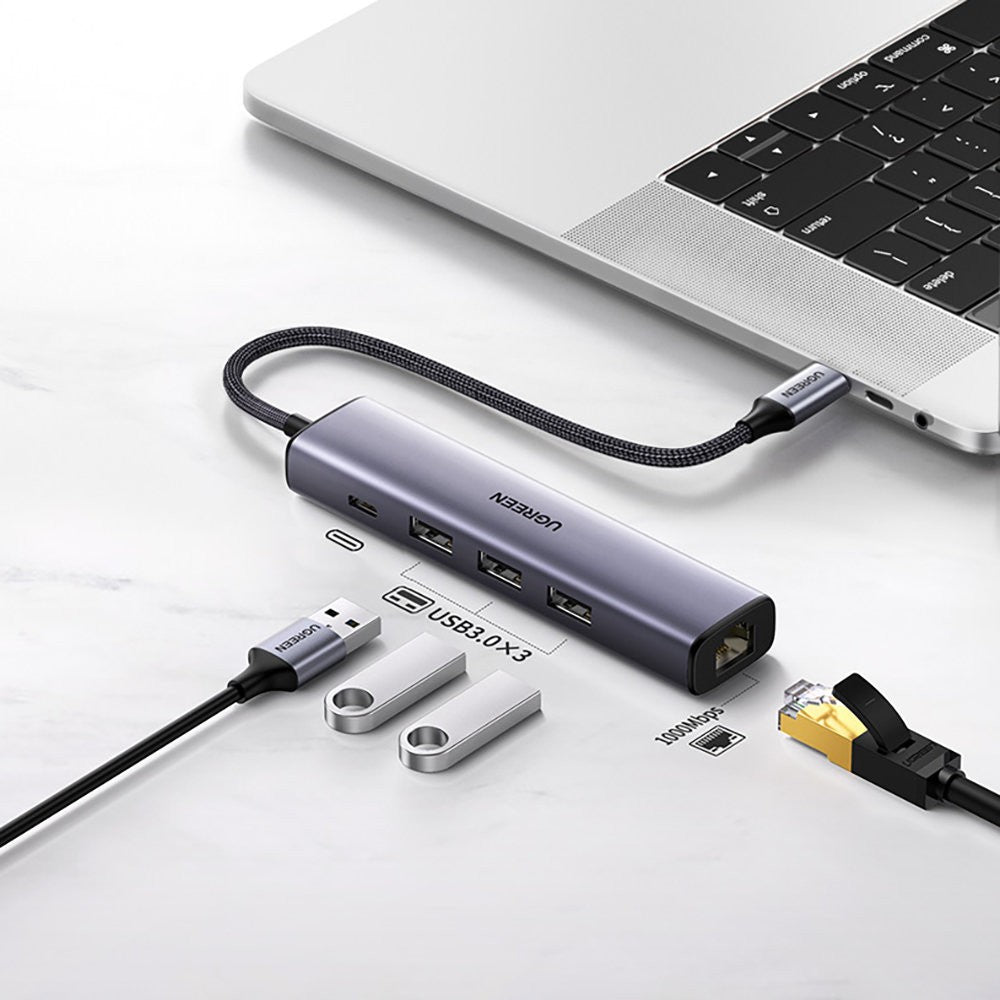 Adapteris Ugreen CM475 USB-C to USB-C + 3xUSB-A + RJ45 pilkas