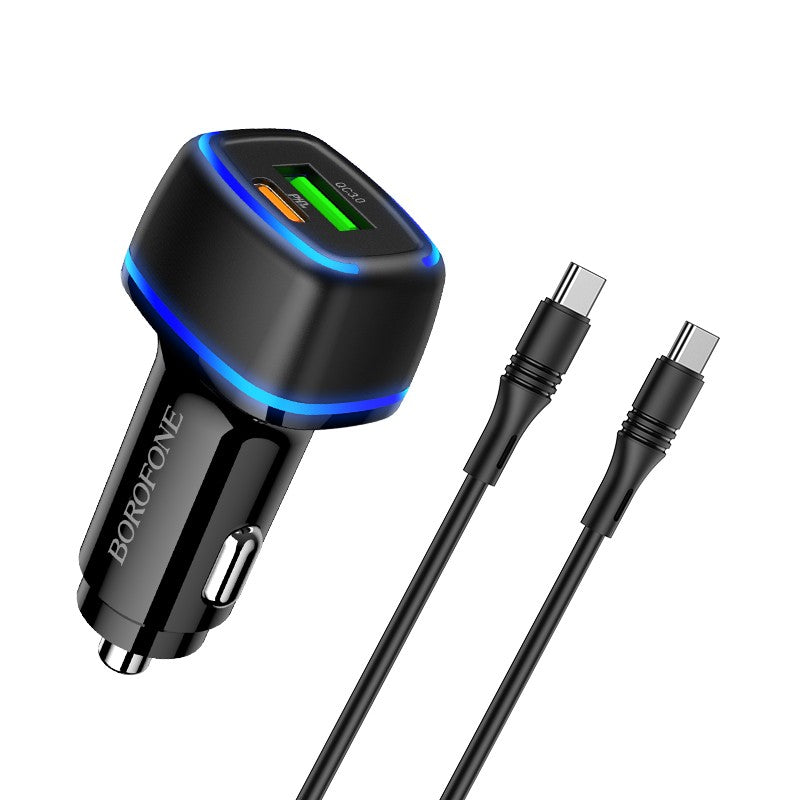 Automobilinis įkroviklis Borofone BZ14A PD20W+QC3.0 su 2 USB jungtimis (Type-C to Type-C) juodas