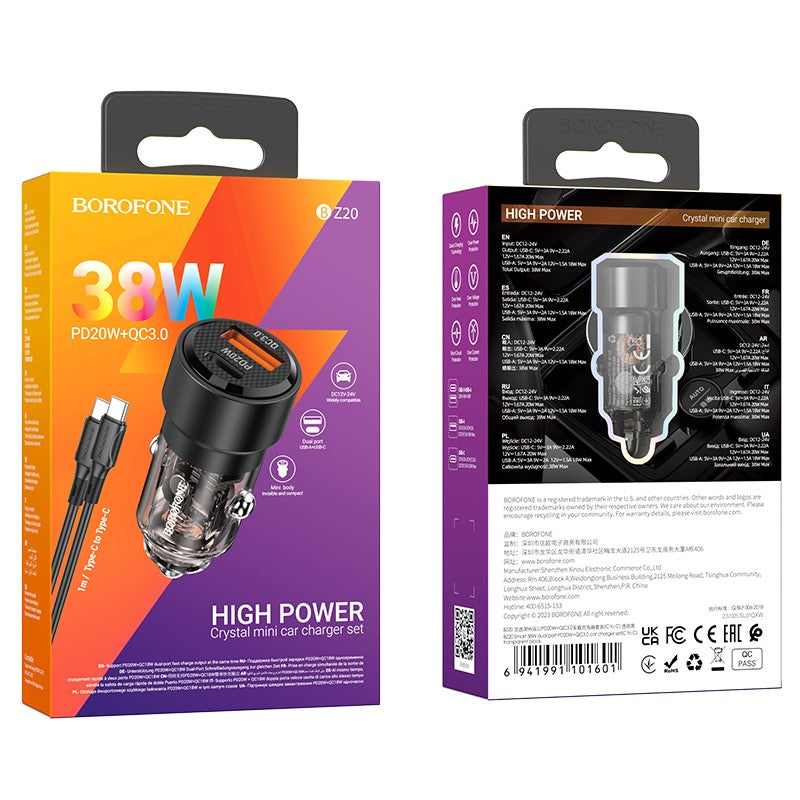Automobilinis įkroviklis Borofone BZ20 PD20W+QC3.0 38W + Type-C juodas