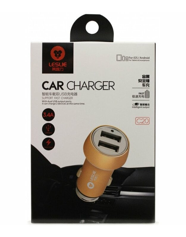 Įkroviklis automobilinis Leslie C20 Metal su 2 USB 3.4A auksinės spalvos