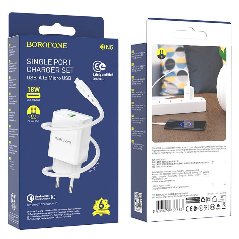 Įkroviklis Borofone BN5 QC 3.0 18W + microUSB, baltas