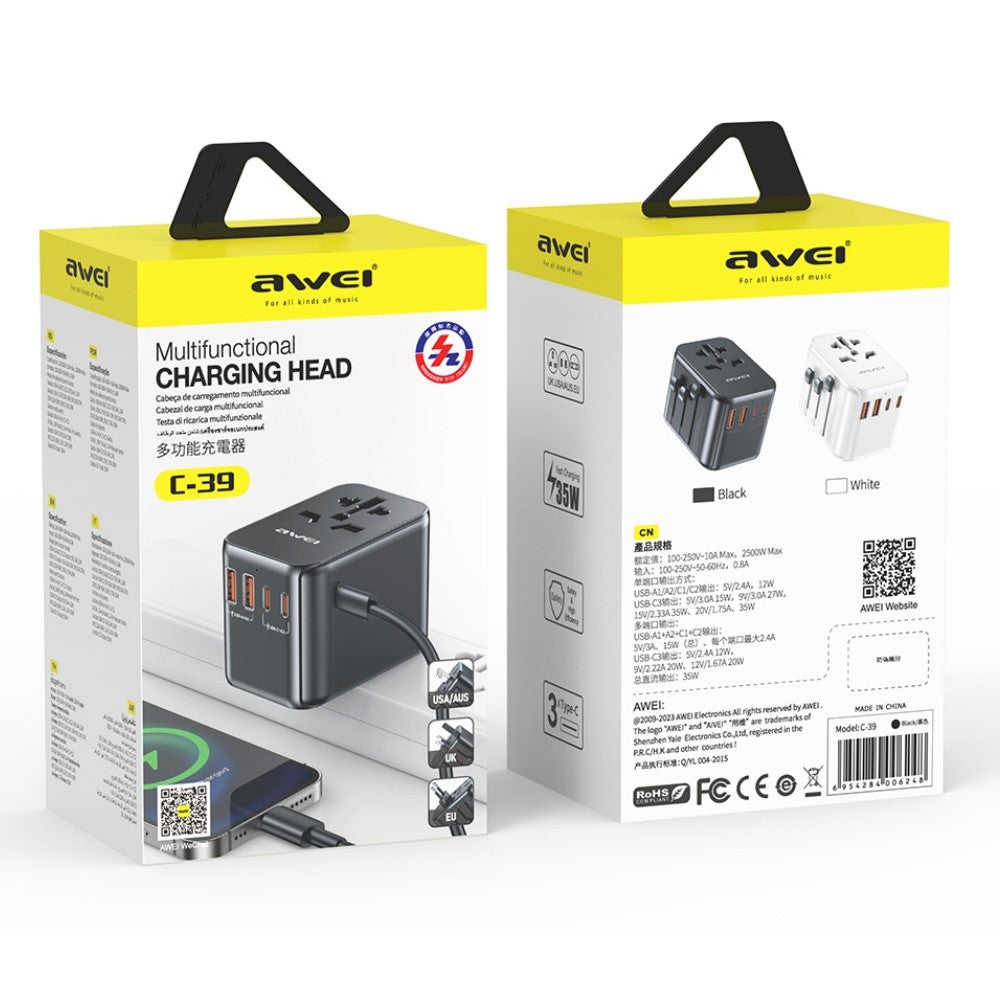 Universalus kelioninis įkroviklis Awei C-39 35W GaN 2xUSB-A/3xUSB-C juodas